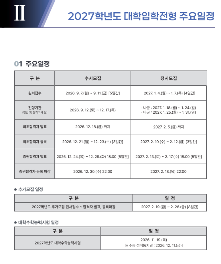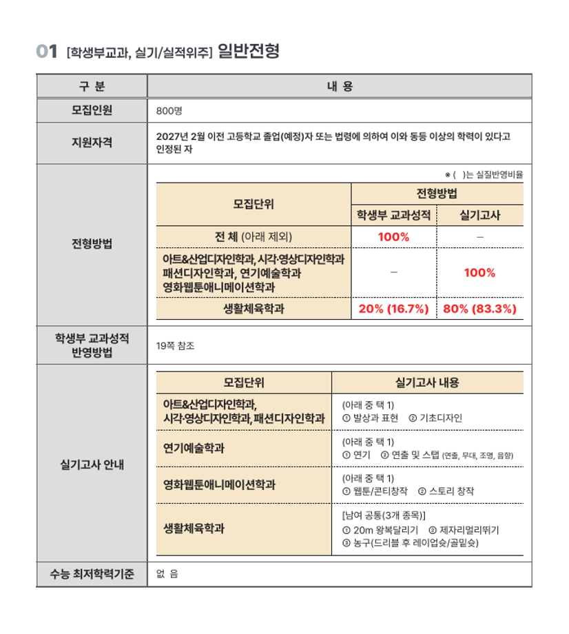 본문 시작 홈으로 입학/취업 학과소개 학과과정 시영소식 입학/취업 AI 학과자랑 SNS소통 홈페이지가이드 입학여기 입학여기 취업지금 전공소개 입학여기 페이스북 트위터 프린트 2027학년도 대학입학전형 시행계획 시각영상디자인학과 49 2026-04-03 본교 2027학년도 대학입학전형 시행계획입니다 첨부파일에 자세한 내용있으니 확인바랍니다~ https://www.semyung.ac.kr/cop/bbs/BBSMSTR_000000000350/selectBoardArticle.do?bbsId=BBSMSTR_000000000350&nttId=472634&bbsTyCode=&bbsAttrbCode=&kind=&mno=sitemap_12&pageIndex=1&searchCnd=&searchWrd= 목록 이전2026학년도 신입생 입학식 안내 만족도조사 만족도 조사 이 페이지에서 제공하는 정보에 대하여 만족하시나요? 매우만족 만족 보통 불만족 매우불만족