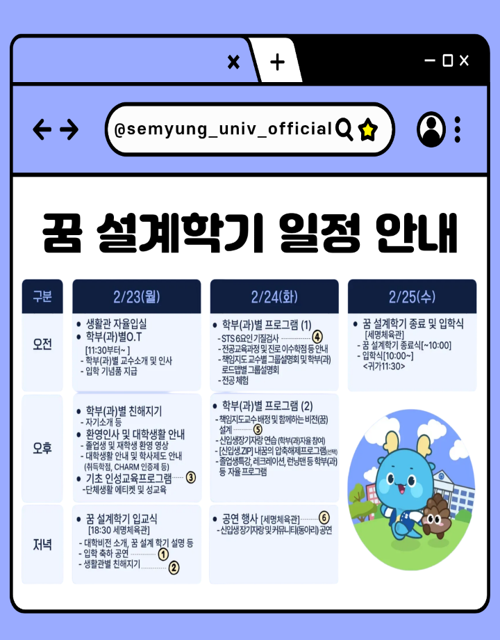 본문 시작 홈으로 커뮤니티 학과소개 교수소개 교육과정 학과 행사 및 활동 커뮤니티 홈페이지가이드 열린정보 학과일정 학과공지 채용정보 및 자료 열린정보 포토갤러리 먹거리, 즐길거리 포토갤러리 사진 사진 영상 사진 페이스북 트위터 프린트 사진 영상 2026학년도 신입생 '꿈 설계학기(오리엔테이션)' 시행 건축학과 399 2026-02-13 https://www.semyung.ac.kr/prog/vwBoard/bbs01/kor/sub08_02_01/view.do?board_num=188873&mno=sub08_02_01&pageIndex=1&searchCondition=&searchKeyword= 목록 이전2026학년도 정시모집 및 편입학 최초합격자 발표 다음 새해 복 많이 받으세요. 만족도조사 만족도 조사 이 페이지에서 제공하는 정보에 대하여 만족하시나요? 매우만족 만족 보통 불만족 매우불만족