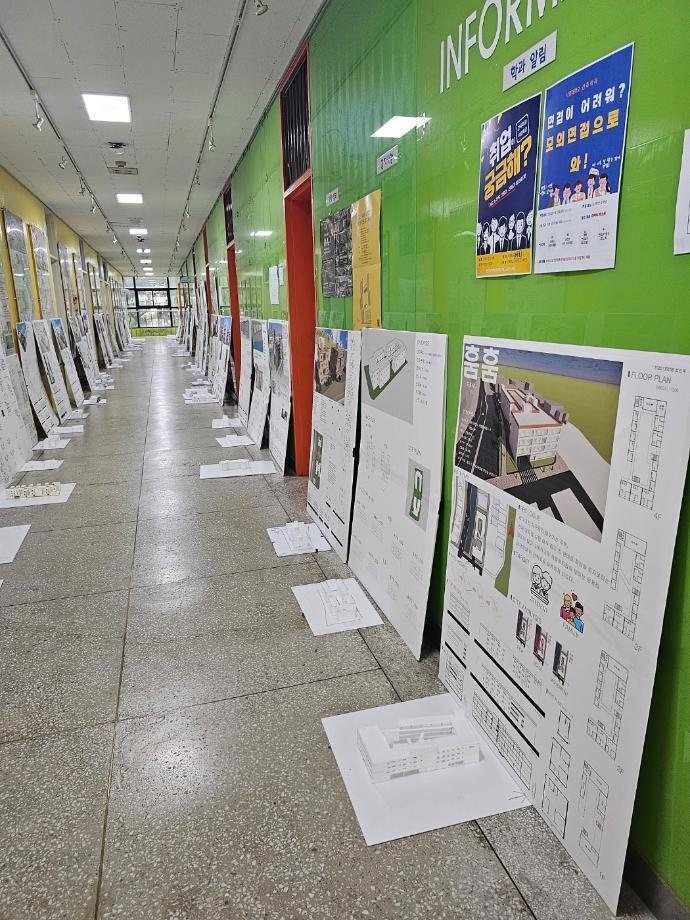 세명대학교 건축학과(학과장 이태구 교수)는 2학년의 연립주택(신월동) 및 3학년의 전시시설 계획안에 대한 공동 크리 틱 및 전시회(건축학과 아키 갤러리)를 10월 11일과 26일에 학술관 1층 로비에서 개최하였다. 재학생들은 8주간 진행한 설계 계획안을 판넬과 모형으로 설명하였고, 설계 담당 교수님(권태호, 이태구, 이완건, 정현정, 조정철)들로부터 간단한 지도를 받았다. 9주차부터 진행되는 2번째 프로젝트(근린생활시설 및 초등학교)에서 좀 더 좋은 계획안이 나올 수 있도 록 진지한 의견들이 논의되었다.