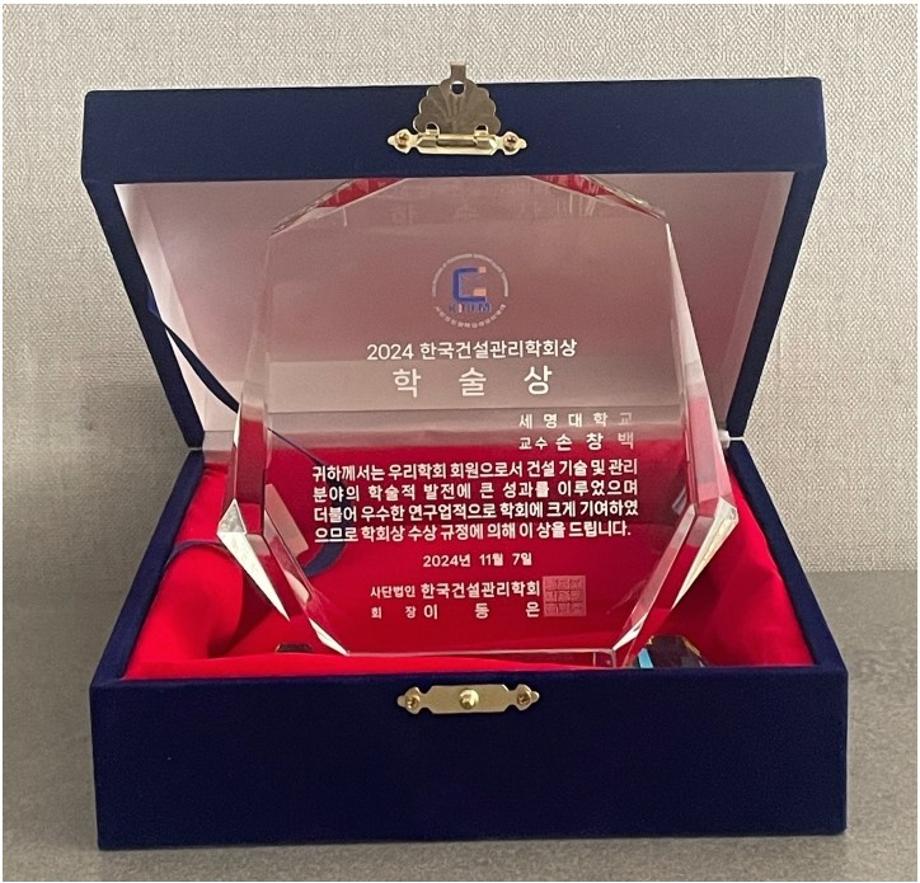 손창백 교수는 27년간 교수로 재직하면서 매년 국내·외 전문학술지 및 학술대회에 건설관리 이론 및 실무에 관한 많은 학술연구 논문을 꾸준히 발표하여 국내 건축시공 및 건설관리 분야의 학술발전과 CM인재 양성에 크게 기여하고 있음을 인정받아 이 상을 수상하였다.