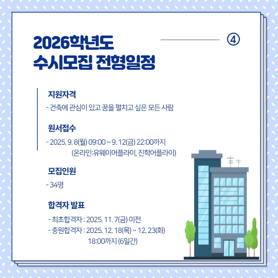 본문 시작 홈으로 커뮤니티 학과소개 교수소개 교육과정 학과 행사 및 활동 커뮤니티 홈페이지가이드 열린정보 학과일정 학과공지 채용정보 및 자료 열린정보 포토갤러리 먹거리, 즐길거리 포토갤러리 사진 사진 영상 사진 페이스북 트위터 프린트 사진 영상 2026학년도 수시모집 - 건축학과 건축학과 1008 2025-08-12 목록 이전2025 지역연계 창의융합 캠프 운영 다음 2026 수시주요사항 및 전년도 입시결과 만족도조사 만족도 조사 이 페이지에서 제공하는 정보에 대하여 만족하시나요? 매우만족 만족 보통 불만족 매우불만족
