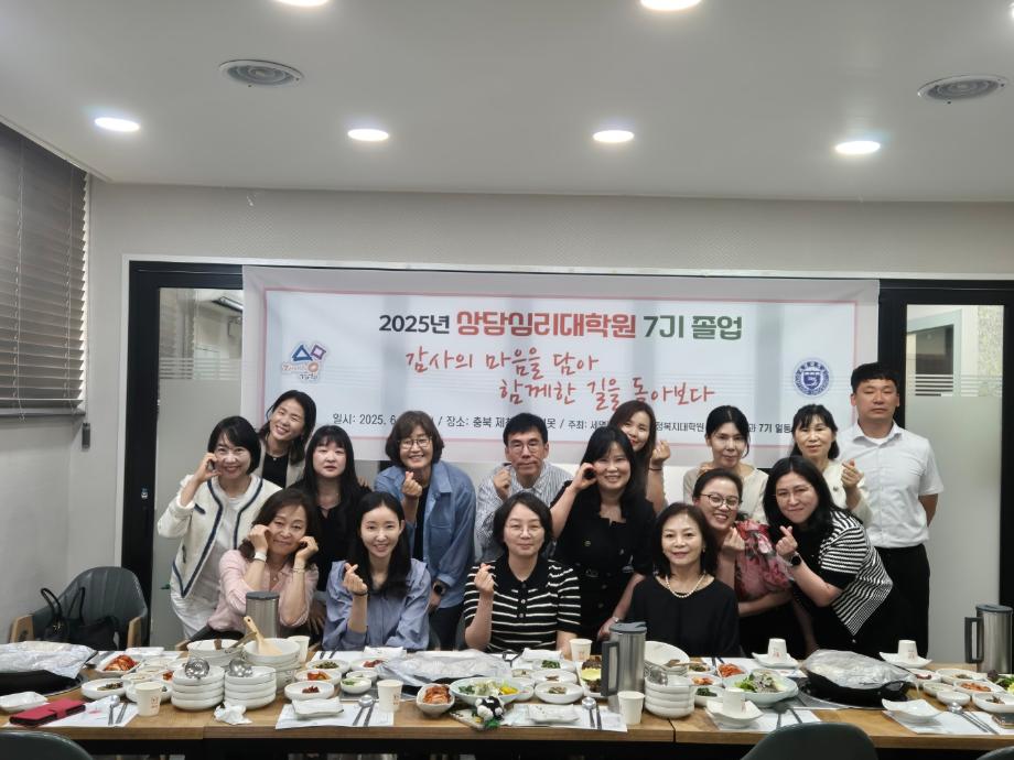 본문 시작 홈으로 대학원 커뮤니티 학부소개 교수소개 교육목표 입학안내 학과 커뮤니티 대학원 커뮤니티 홈페이지가이드 대학원 갤러리 대학원 소식 대학원 일정 대학원 갤러리 대학원 갤러리 페이스북 트위터 프린트 석사과정 사은회 개최 상담심리학과 671 2025-06-19 안녕하십니까 세명대학교 상담심리학과입니다. 7기 석사 과정생분들의 졸업을 기념하여 상담심리학과 교수님들과 함께 식사하는 시간을 가졌습니다! 그동안 수고해주신 교수님들께 꽃다발을 전달하고 수업을 들으며 어려웠던 점, 앞으로의 계획, 감사 인사 등 많은 이야기를 나누며 좋은 시간을 보냈습니다. 졸업을 축하드리며 그동안 고생 많으셨습니다. 졸업 후에도 빛날 여러분들의 앞날을 응원하겠습니다. :) 목록 이전석사과정 현장견학 프로그램 다음 표현예술치료 특강 만족도조사 만족도 조사 이 페이지에서 제공하는 정보에 대하여 만족하시나요? 매우만족 만족 보통 불만족 매우불만족