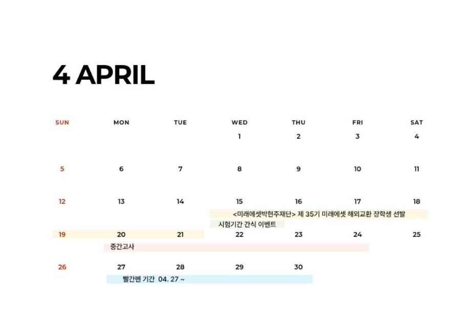 본문 시작 홈으로 학과 커뮤니티 학부소개 교수소개 교육목표 입학안내 학과 커뮤니티 대학원 커뮤니티 홈페이지가이드 학과 갤러리 학과소식 학사일정 학과 갤러리 학과 갤러리 페이스북 트위터 프린트 4월 학사일정 상담심리학과 38 2026-04-17 안녕하세요 세명대학교 상담심리학과입니다! 4월 학사일정 안내드립니다. 4/20(월)~24(금)은 중간고사 기간입니다. 노력한 만큼 좋은 결과 있길 바랍니다 :) 목록 이전Shine-up 동아리 봉사 활동 다음 심리극과 연극치료 학술특강 만족도조사 만족도 조사 이 페이지에서 제공하는 정보에 대하여 만족하시나요? 매우만족 만족 보통 불만족 매우불만족