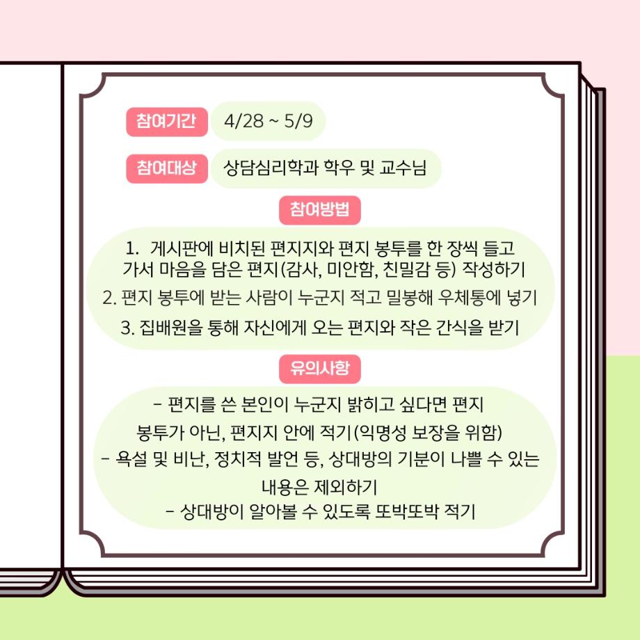 본문 시작 홈으로 학과 커뮤니티 학부소개 교수소개 교육목표 입학안내 학과 커뮤니티 대학원 커뮤니티 홈페이지가이드 학과 갤러리 학과소식 학사일정 학과 갤러리 학과 갤러리 페이스북 트위터 프린트 상담심리학과 표현데이 이벤트 상담심리학과 491 2025-04-29 안녕하세요 세명대학교 상담심리학과입니다! 여러분은 평소 고마웠던 마음이나 미안했던 감정을 전하고 싶었지만 말로 표현하기 어려웠던 순간이 있나요? 학과 동아리 GRIT에서 여러분의 따뜻한 마음을 전할 수 있도록 작은 이벤트를 준비했습니다! 참여기간: 4/28 ~ 5/9 참여대상: 상담심리학과 학우 및 교수님 짧은 한 마디로도 진심을 전할 수 있습니다! 많은 관심 부탁드립니다 :) 목록 다음 2025 상담심리학과 MT 다음 상담심리학과 표현데이 활동 소감 만족도조사 만족도 조사 이 페이지에서 제공하는 정보에 대하여 만족하시나요? 매우만족 만족 보통 불만족 매우불만족