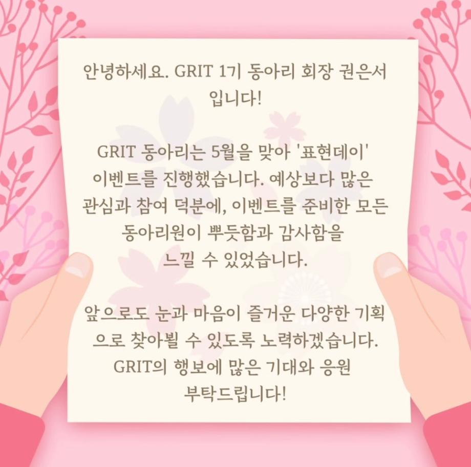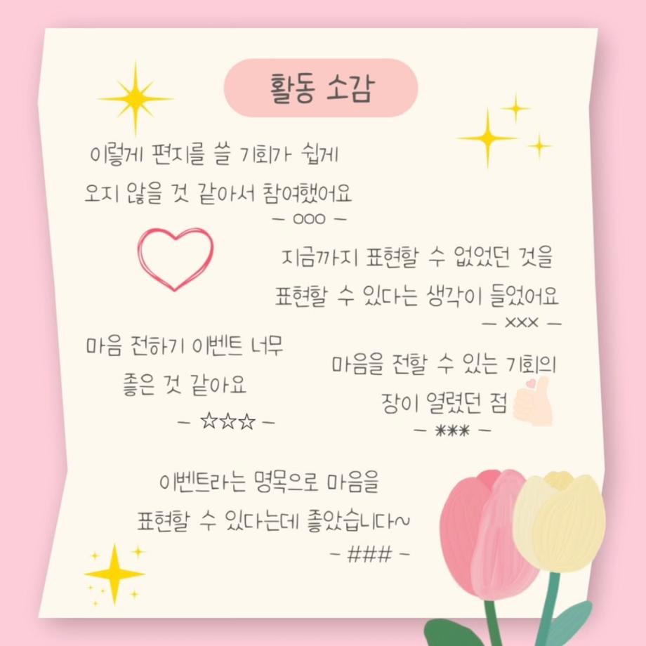본문 시작 홈으로 학과 커뮤니티 학부소개 교수소개 교육목표 입학안내 학과 커뮤니티 대학원 커뮤니티 홈페이지가이드 학과 갤러리 학과소식 학사일정 학과 갤러리 학과 갤러리 페이스북 트위터 프린트 상담심리학과 표현데이 활동 소감 상담심리학과 609 2025-06-02 안녕하세요 세명대학교 상담심리학과입니다! 상담심리학과의 유일한 기획 동아리 GRIT에서 4월 28일부터 5월 9일까지 표현데이 이벤트를 진행했습니다! 평소 마음을 전하지 못했던 대상에게 편지로 마음을 전할 수 있어 모두에게 의미 있는 시간이 되었던 것 같습니다 :) 앞으로도 다양한 이벤트를 진행한다고 하니 많은 관심 부탁드립니다~ 목록 이전상담심리학과 표현데이 이벤트 다음 6월 학사일정 만족도조사 만족도 조사 이 페이지에서 제공하는 정보에 대하여 만족하시나요? 매우만족 만족 보통 불만족 매우불만족