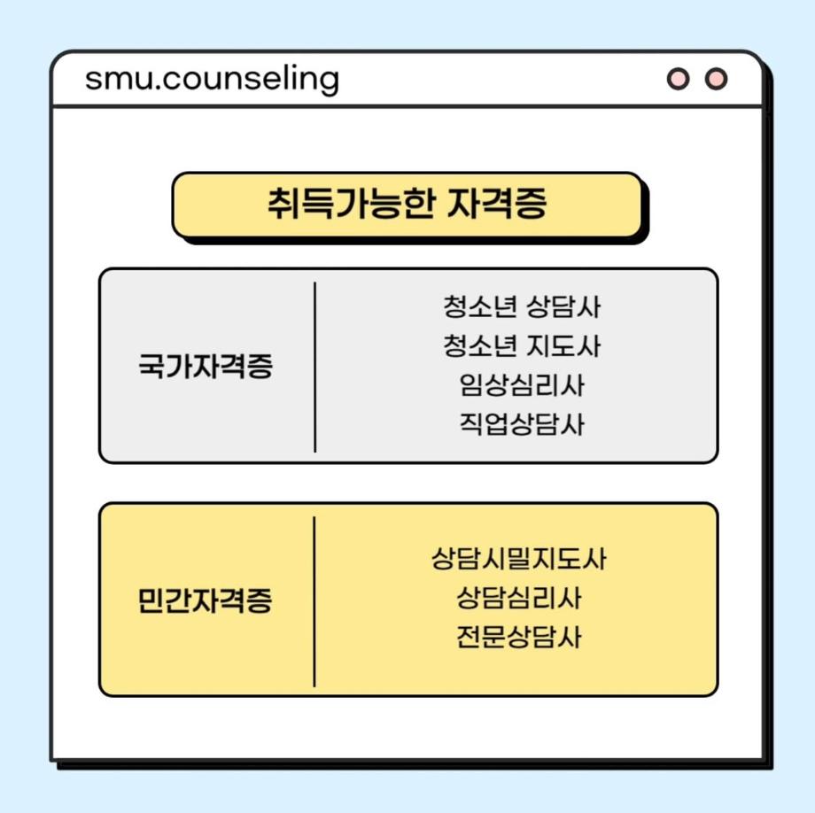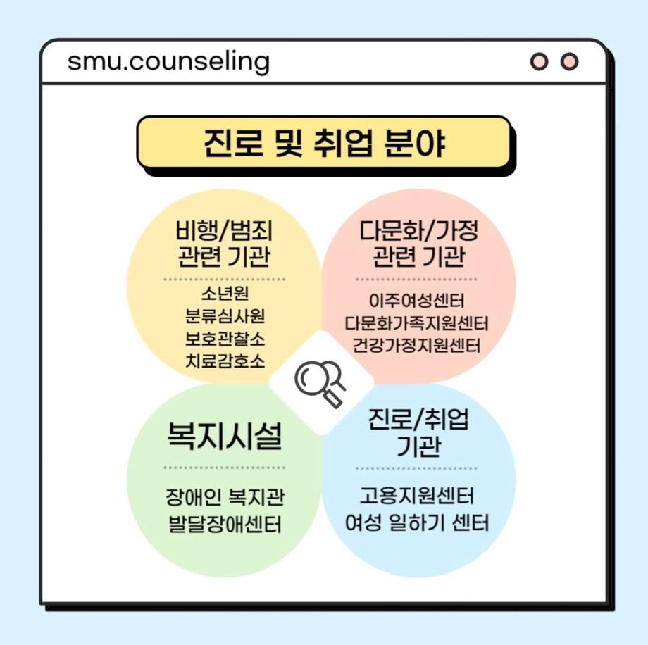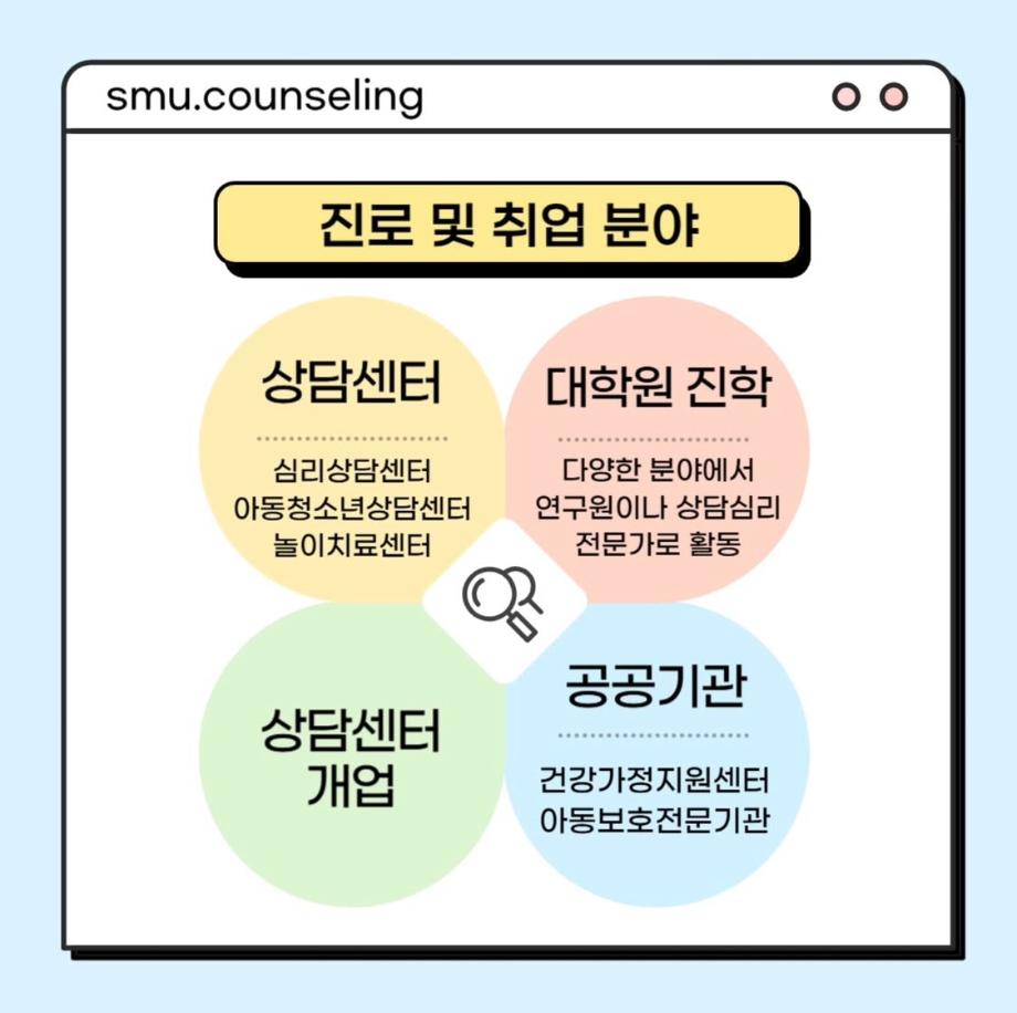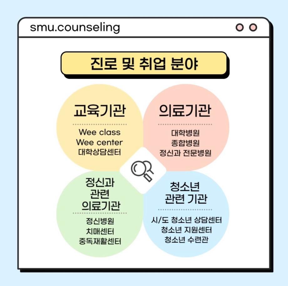 본문 시작 홈으로 학과 커뮤니티 학부소개 교수소개 교육목표 입학안내 학과 커뮤니티 대학원 커뮤니티 홈페이지가이드 학과 갤러리 학과소식 학사일정 학과 갤러리 학과 갤러리 페이스북 트위터 프린트 자격증&진로 소개 상담심리학과 766 2025-07-30 안녕하십니까 세명대학교 상담심리학과입니다! 오늘은 상담사가 되기 위해 필요한 자격증, 취업 분야를 소개해드리려고 합니다. 상담심리학과 졸업 후에는 교육기관, 의료기관, 복지시설 등 다양한 분야에서 활동할 수 있습니다 :) 목록 이전[현직자 인터뷰] 평창군청소년상담복지센터 다음 [현직자 인터뷰] 육군 상담사 만족도조사 만족도 조사 이 페이지에서 제공하는 정보에 대하여 만족하시나요? 매우만족 만족 보통 불만족 매우불만족